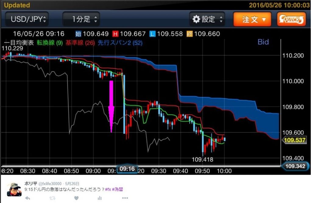 ■5月26日ドル円急落(ボリ平Twitter画像から)